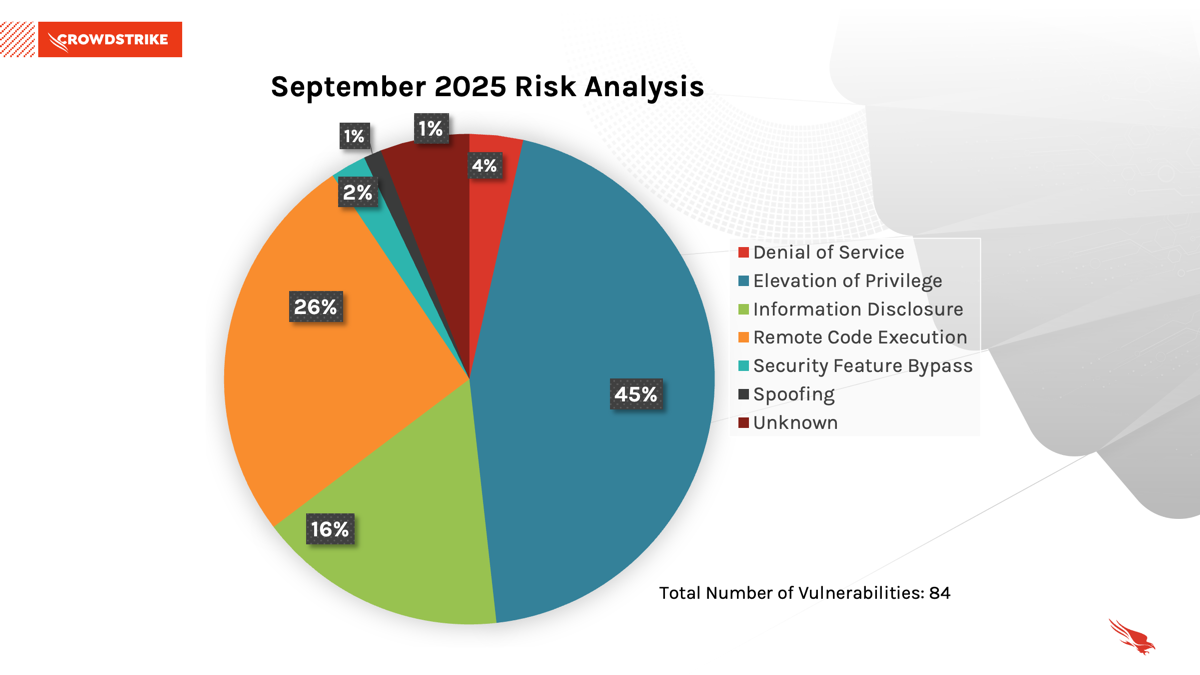 Los principales tipos de riesgo de este mes por técnica de explotación son la elevación de privilegios con 38 parches (45 %), la ejecución remota de código (RCE) con 21 parches (26 %) y la divulgación de información con 13 (16 %). Cabe destacar que muchas de las CVE críticas anunciadas este mes requieren cierto grado de interacción por parte del usuario.
